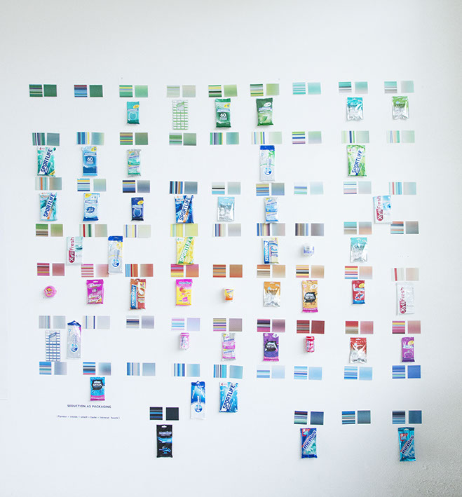 An interactive installation existing of candy dispensers, plastic bags, and andies.